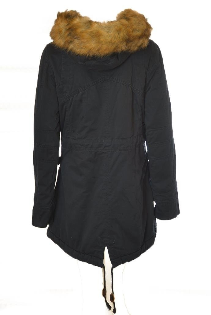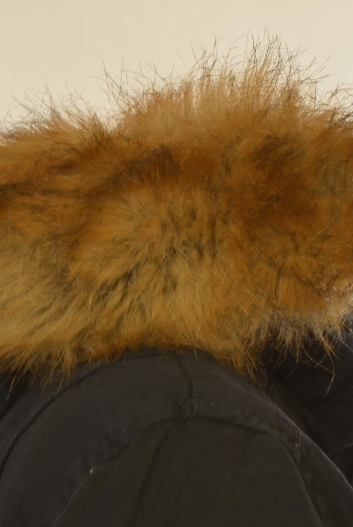 Granatowy płaszcz zapinany na zamek. W środku obszyty futerkiem i wiązany w pasie. Kaptur obszyty sztucznym lisem.