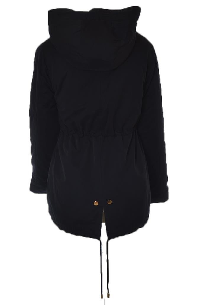 Czarna ocieplana kurtka zimowa. Zapinana na zamek oraz wiązana w pasie sznurkiem. Kaptur ocieplany wełną.