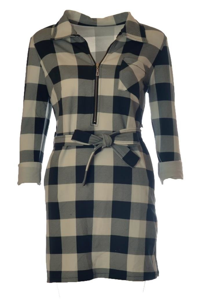 Biało-czarna sukienka w kratę, wiązana w pasie oraz zapinana na zamek. Z przodu naszyta kieszonka.
