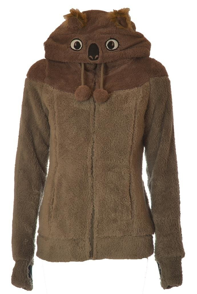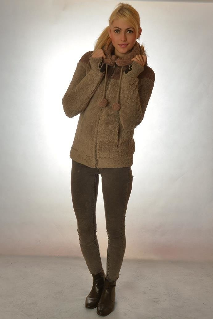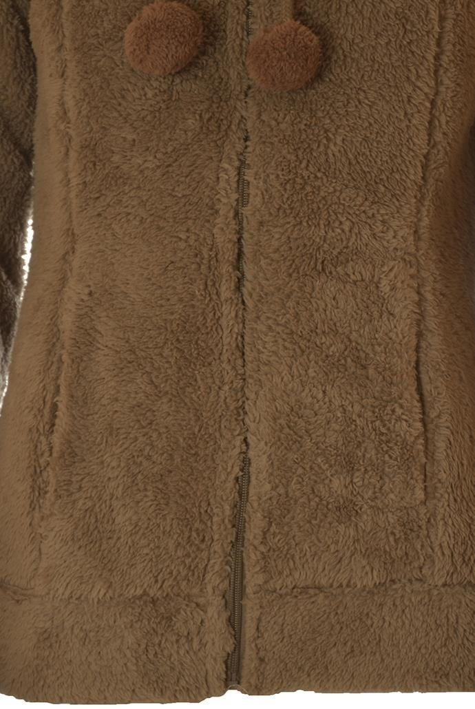 Brązowa bluza misiek. Przy kapturze uszka z włoskami oraz pompony. Przy rękawach naszyte łapki.