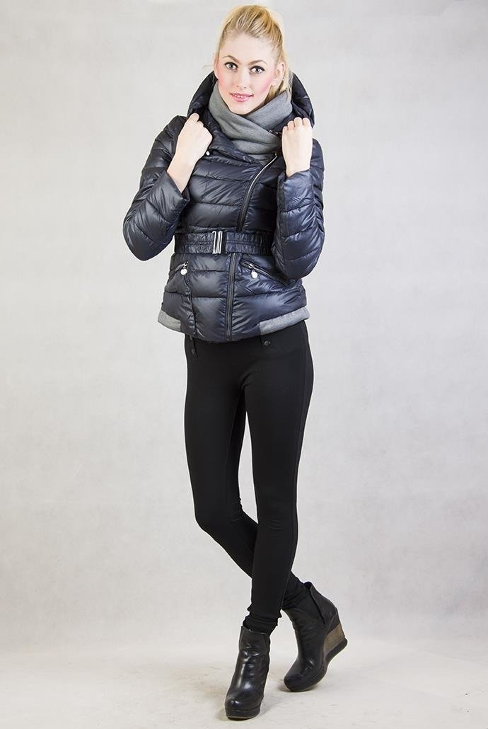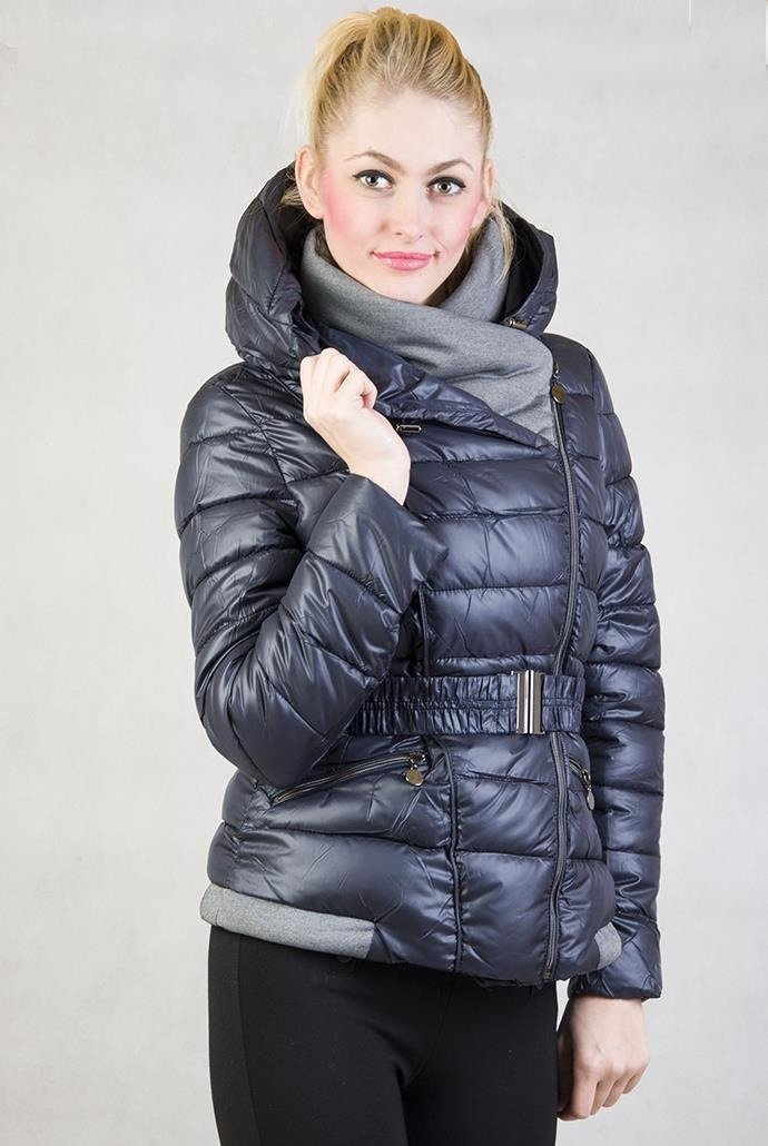Granatowa kurtka zimowa zapinana na zamek oraz ściągana paskiem. Kaptur z bawełnianą podszewką. W środku ocieplana futerkiem.