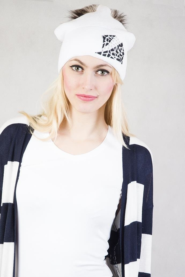 Biała czapka z doszytym znaczkiem w trójkąty oraz cekiny