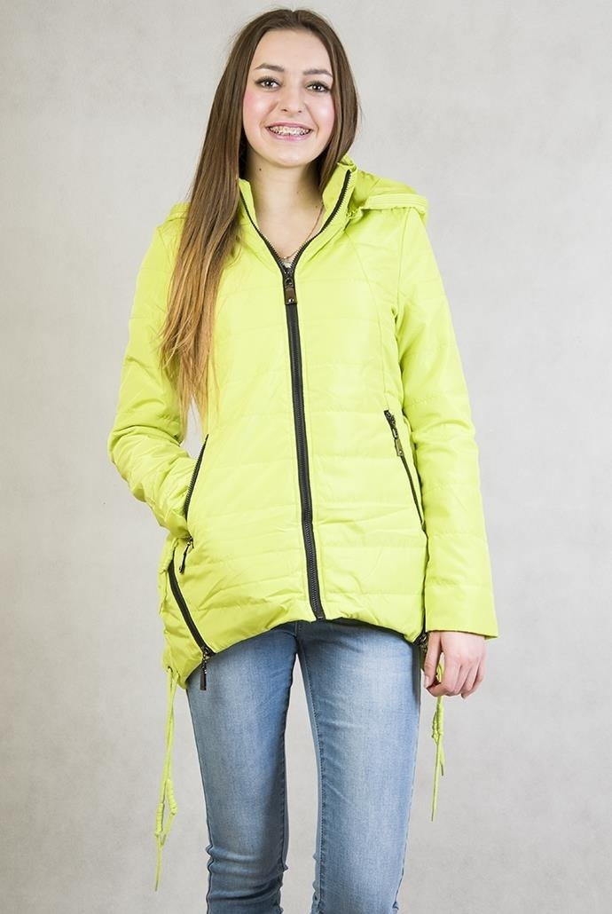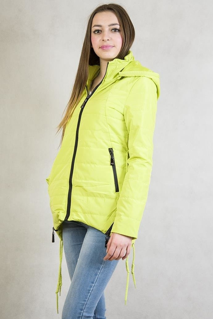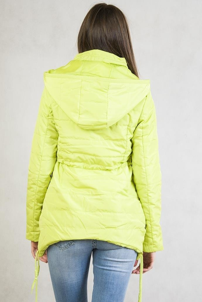 Wiosenna, asymetryczna limonkowa kurtka z kapturem zapinana na zamek.