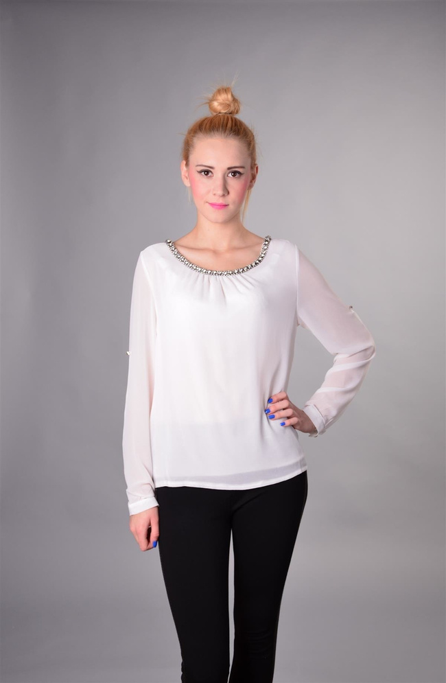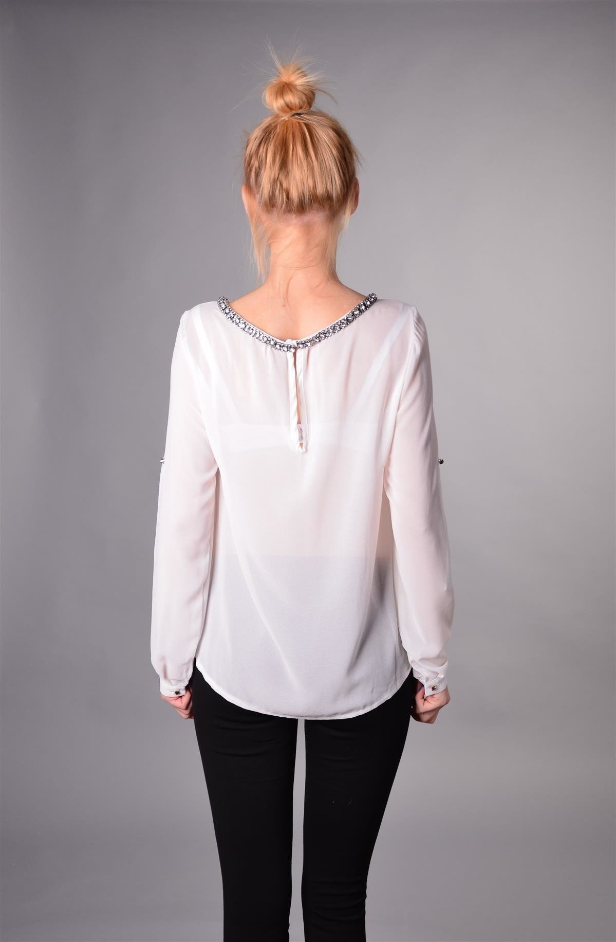 Elegancka koszula z cienkiego, lekko prześwitującego materiału, ze zdobieniem przy dekolcie, które nadaje jej uroku, idealna na wiele okazji.