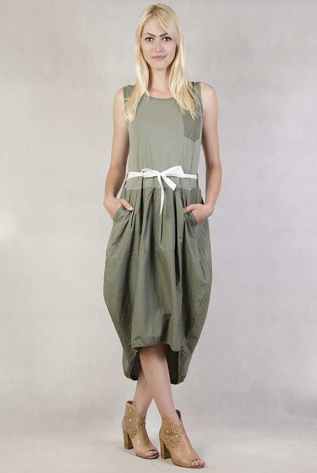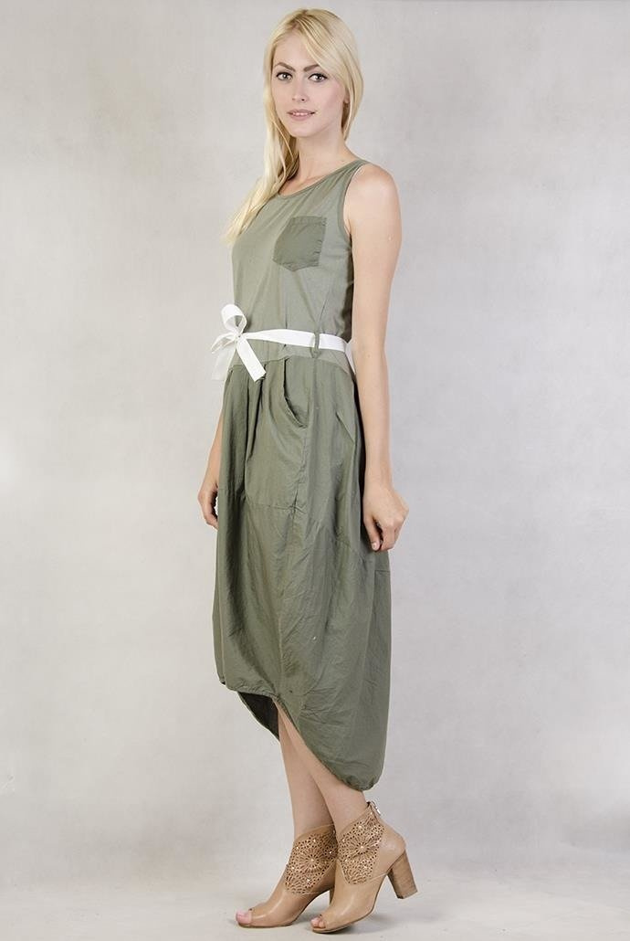 Zielona sukienka wiązana w pasie z przedłużanym tyłem