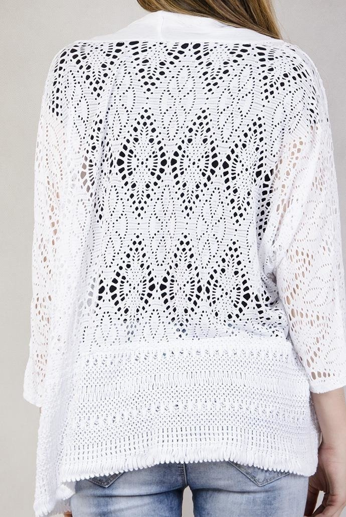 Koronkowa narzutka z szerokim plecionym pasem na dole biała