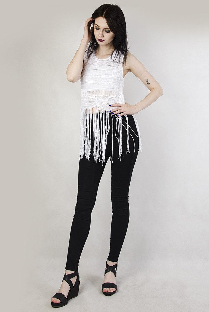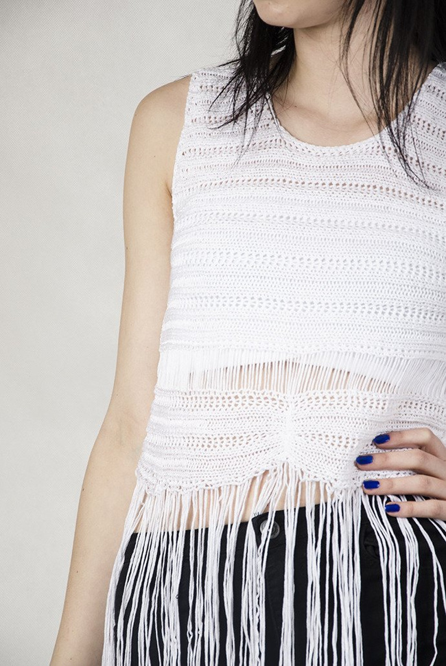 Biała ażurowa bluzka z frędzlami.