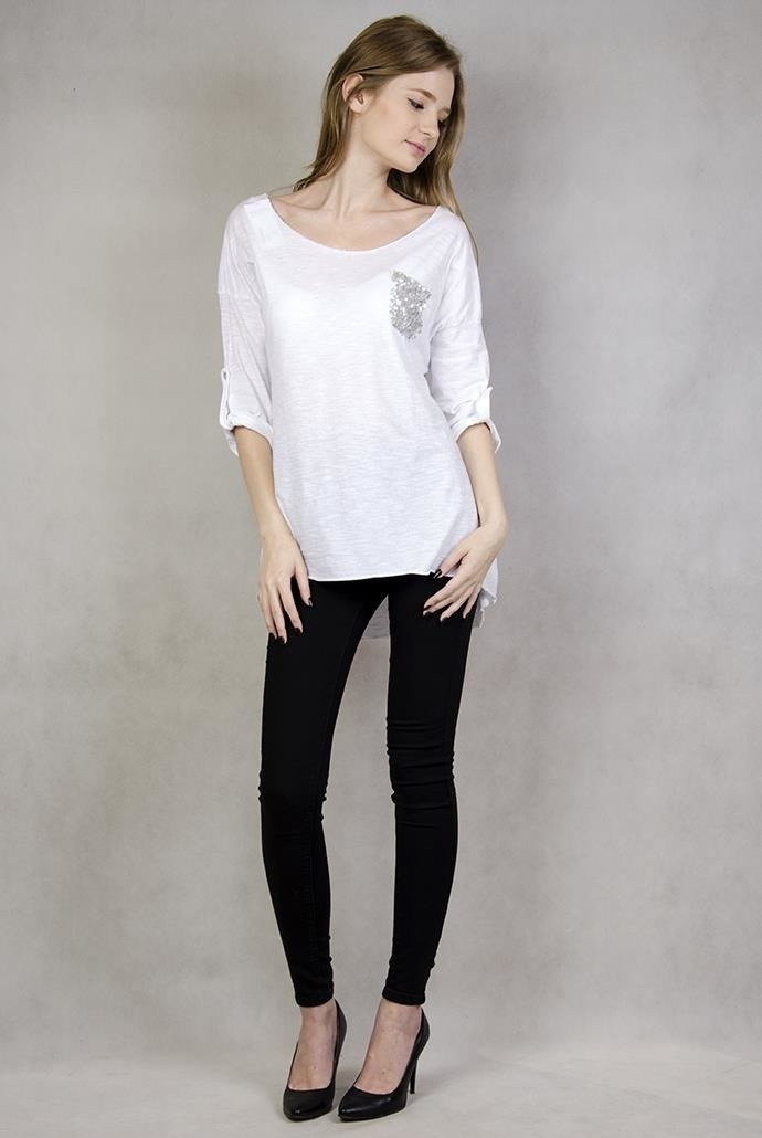 Asymetryczna biała bluzka z cekinami umieszczonymi na kieszonce.
