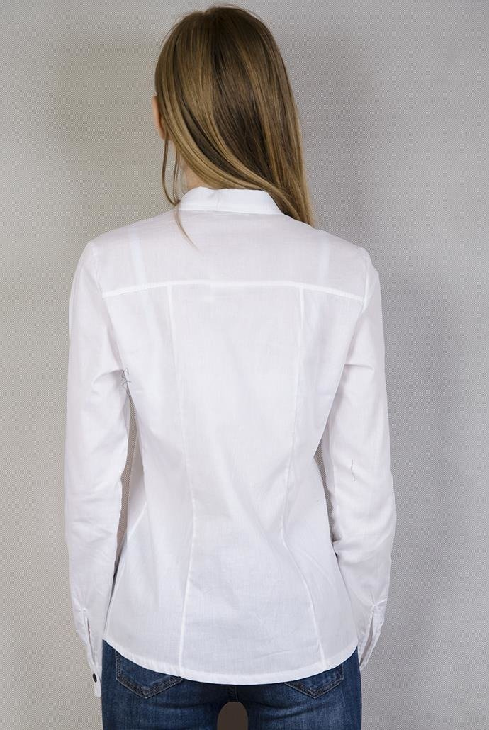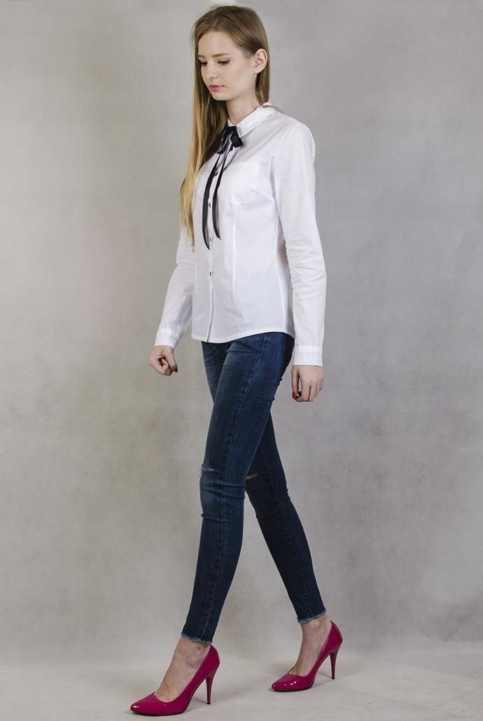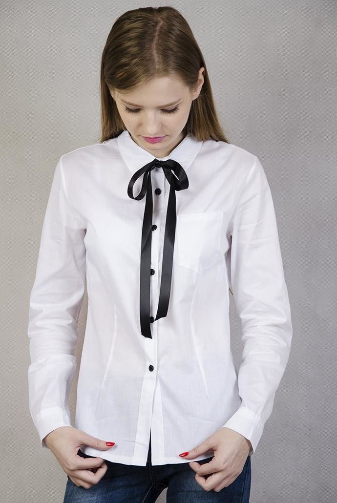 Biała koszula z czarną wstążką i czarnymi guzikami