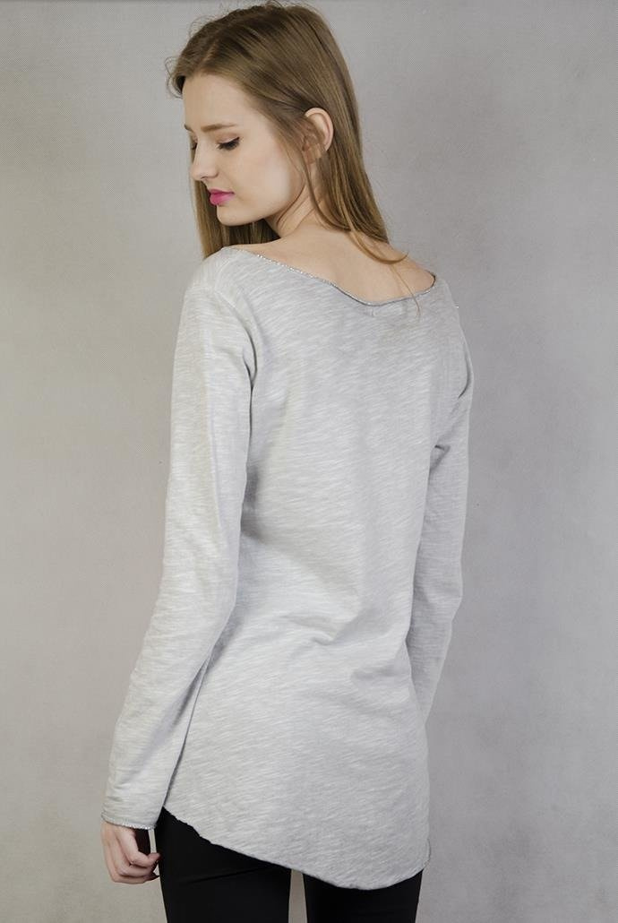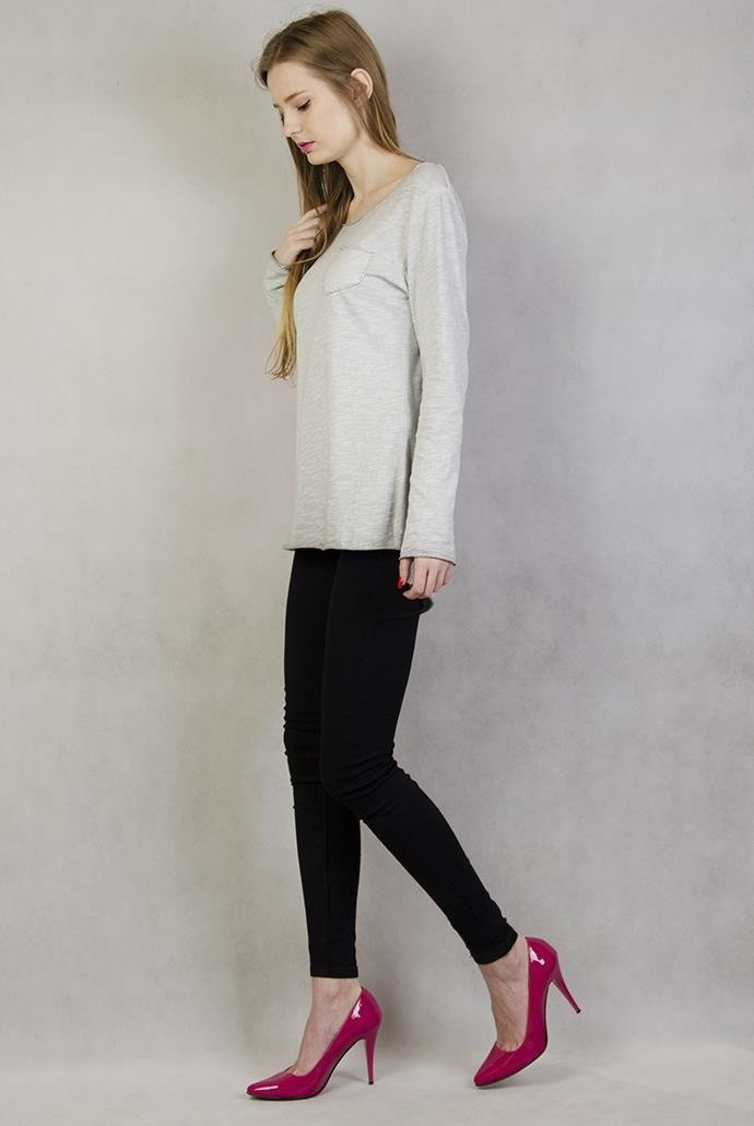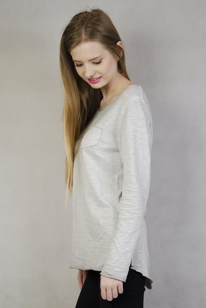 Jasnoszara bluzka z kieszonką i srebrną nitką przy dekolcie i kieszonce