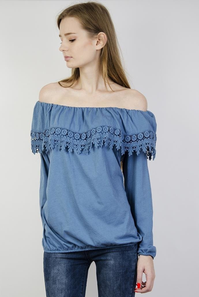 Niebieska bluzka z hiszpańskim dekoltem i zdobieniami, na długi rękaw