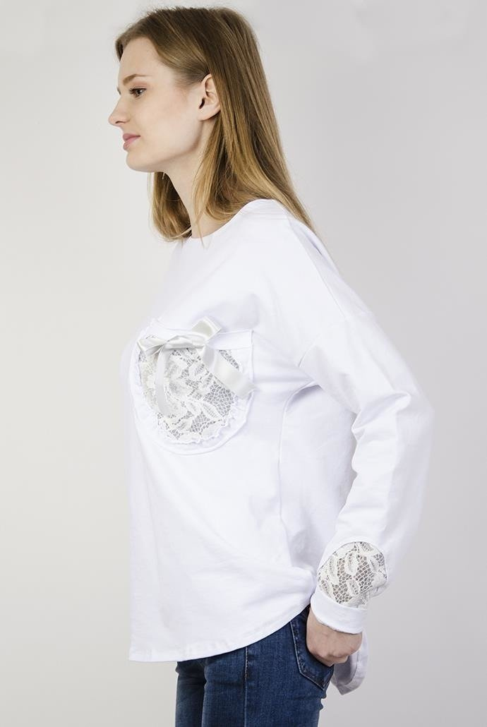 Biała bluzka z kokardką przy kieszonce i zdobieniami przy rękawach