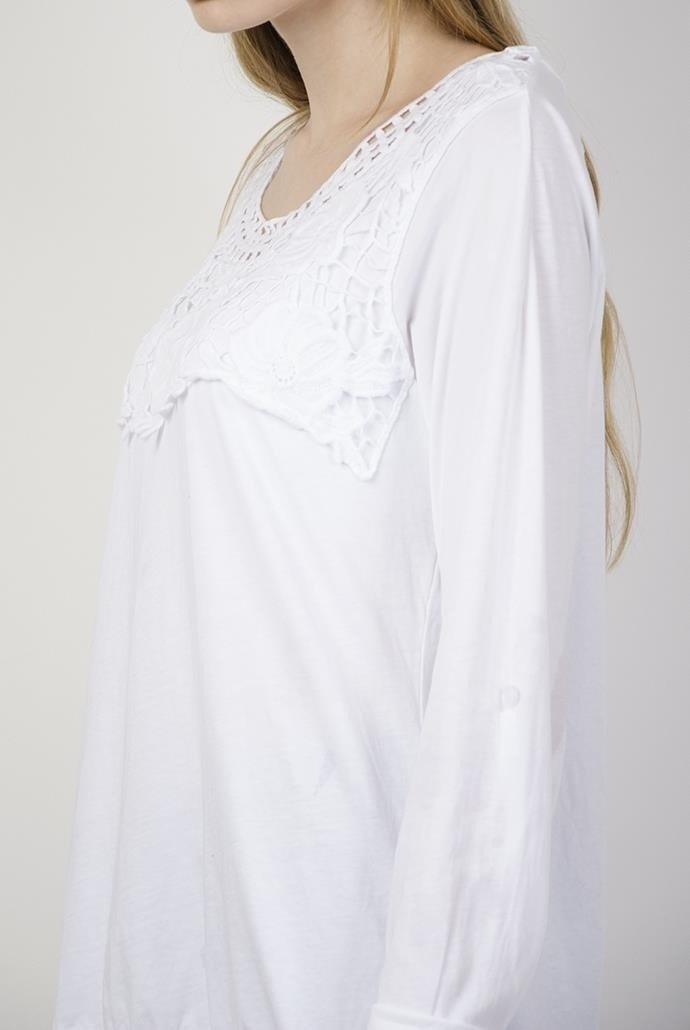 Biała bluzka z ażurowymi zdobieniami przy dekolcie oraz ze ściągaczem na dole