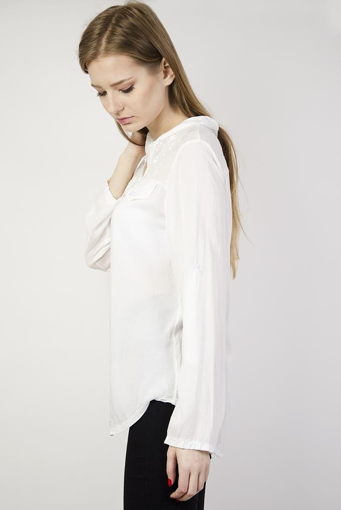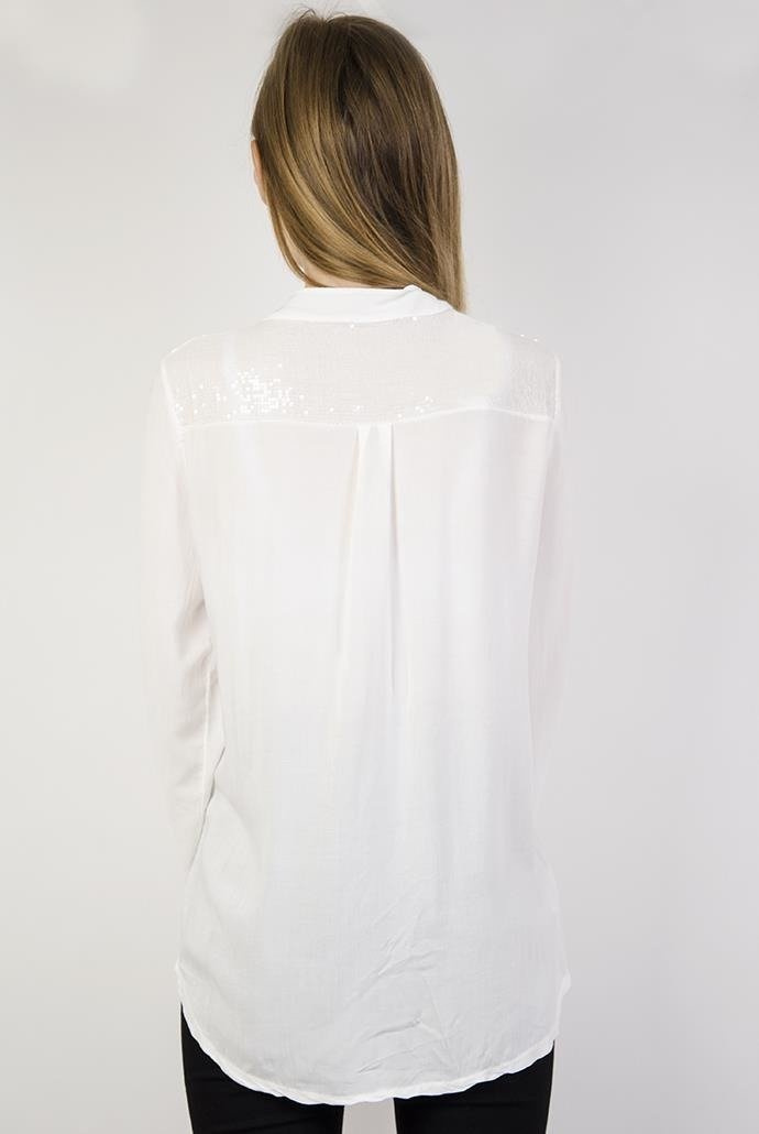Koszula mgiełka biała z cekinami, asymetryczna Wymiary dla rozmiaru ONE-SIZE: Długość całkowita: 61 cm (przód) 65 cm (tył) Długość rękawa: 59 cm Szerokość pod pachami: 50 cm