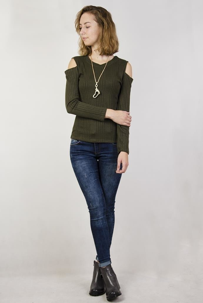 Zielona bluzka z wycięciem na ramionach + wisiorek