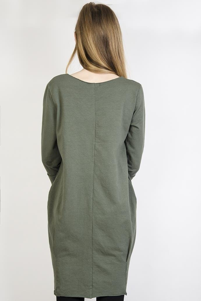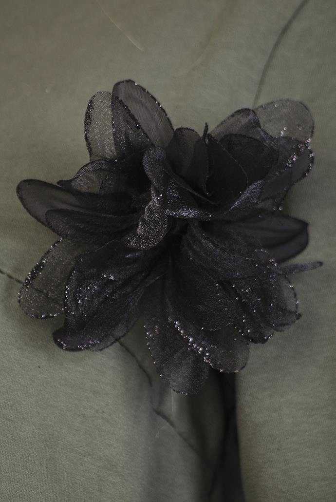Zielona tunika z czarnym dopinanym kwiatem, posiada kieszenie i rozszerzany dół.