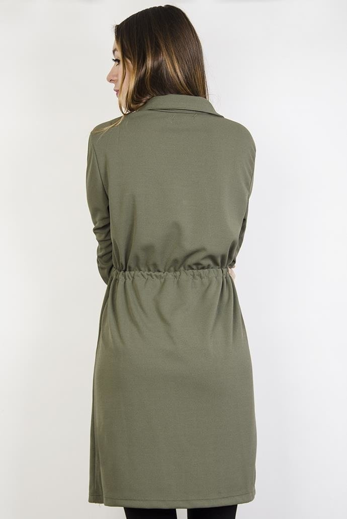 Zielona sukienka ze ściągaczem w talii, posiada złote guziczki i długi rękaw.