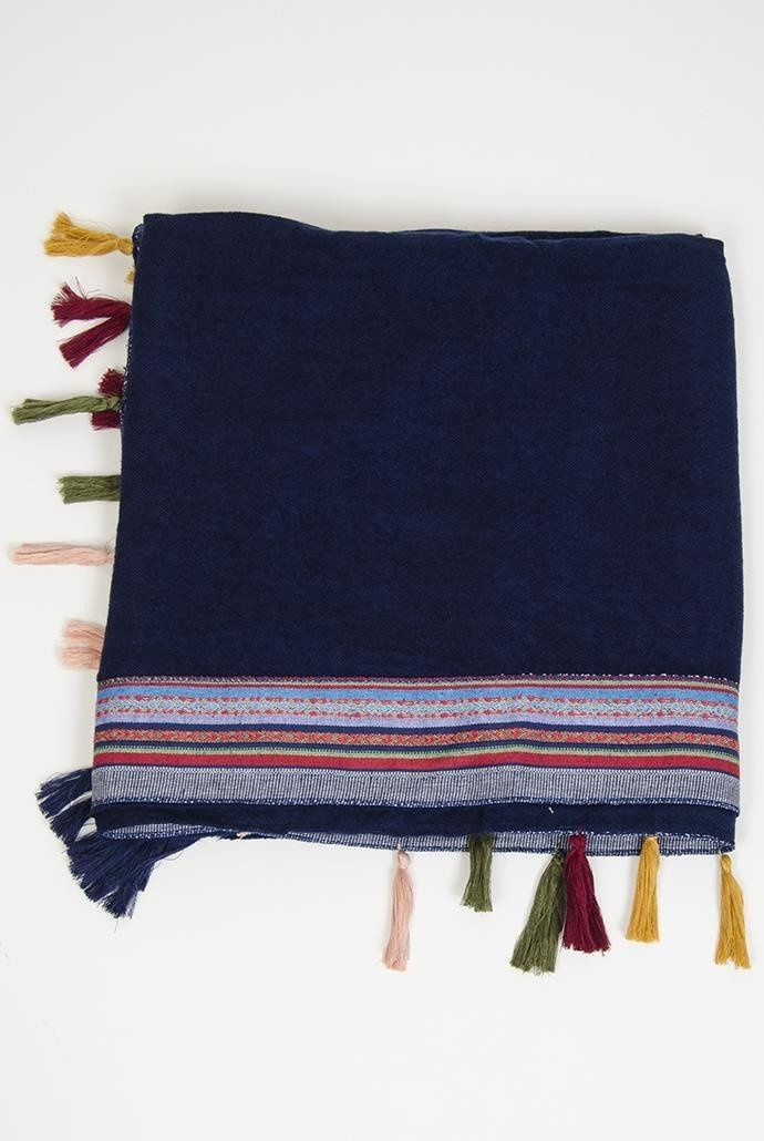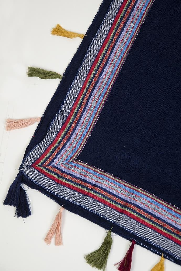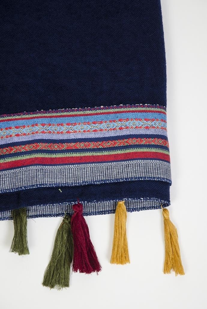 Duży granatowy szal z kolorowymi zdobieniami