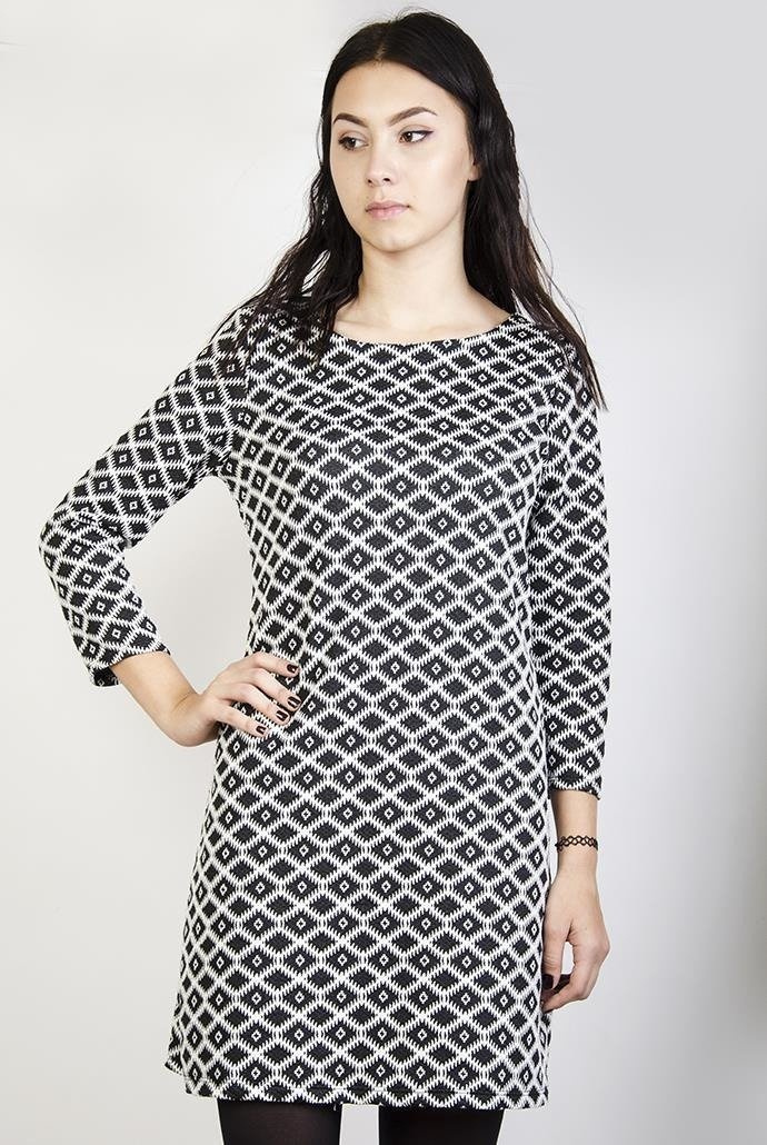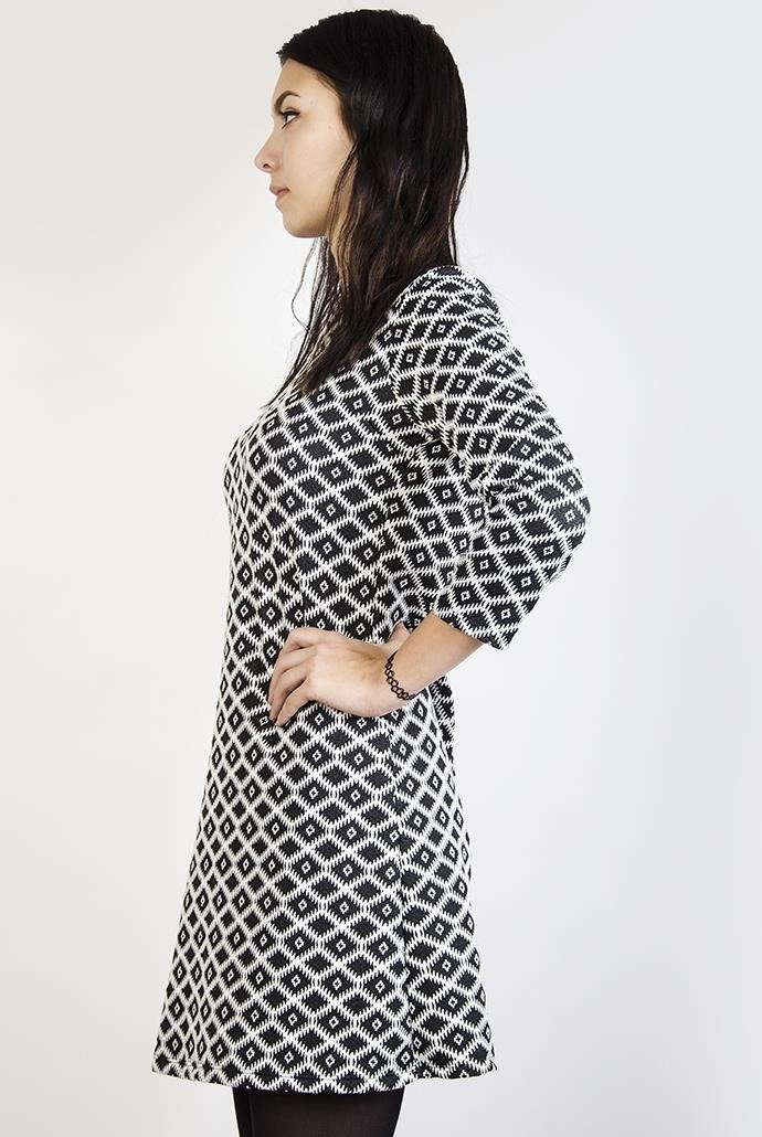 Biało-czarna sukienka w romby z rękawem o długości 7/8.