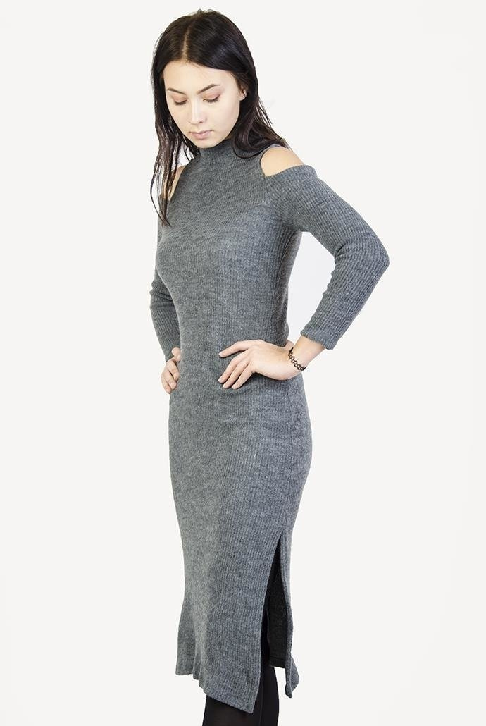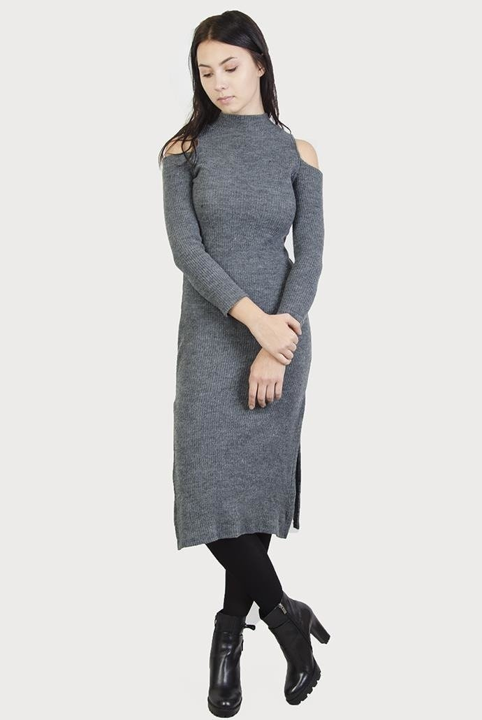 Szara, prążkowana sukienka midi z wycięciami na ramionach