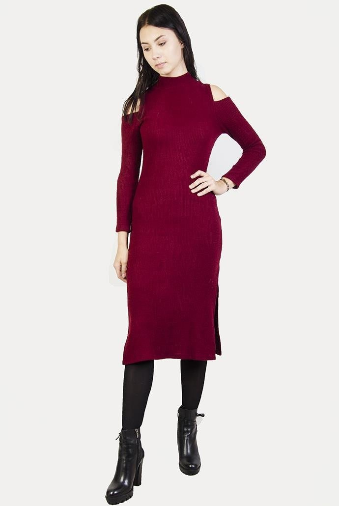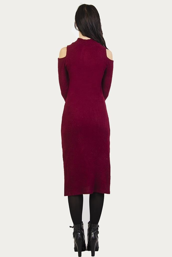 Bordowa, prążkowana sukienka midi z wycięciami na ramionach