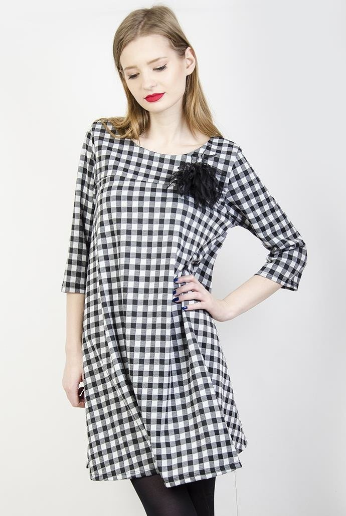Rozkloszowana biało-czarna sukienka w kratę z broszką kwiatem.