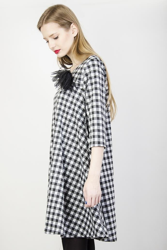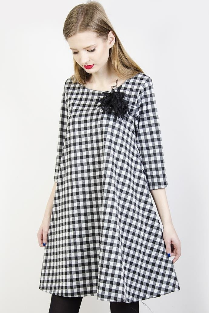 Rozkloszowana biało-czarna sukienka w kratę z broszką