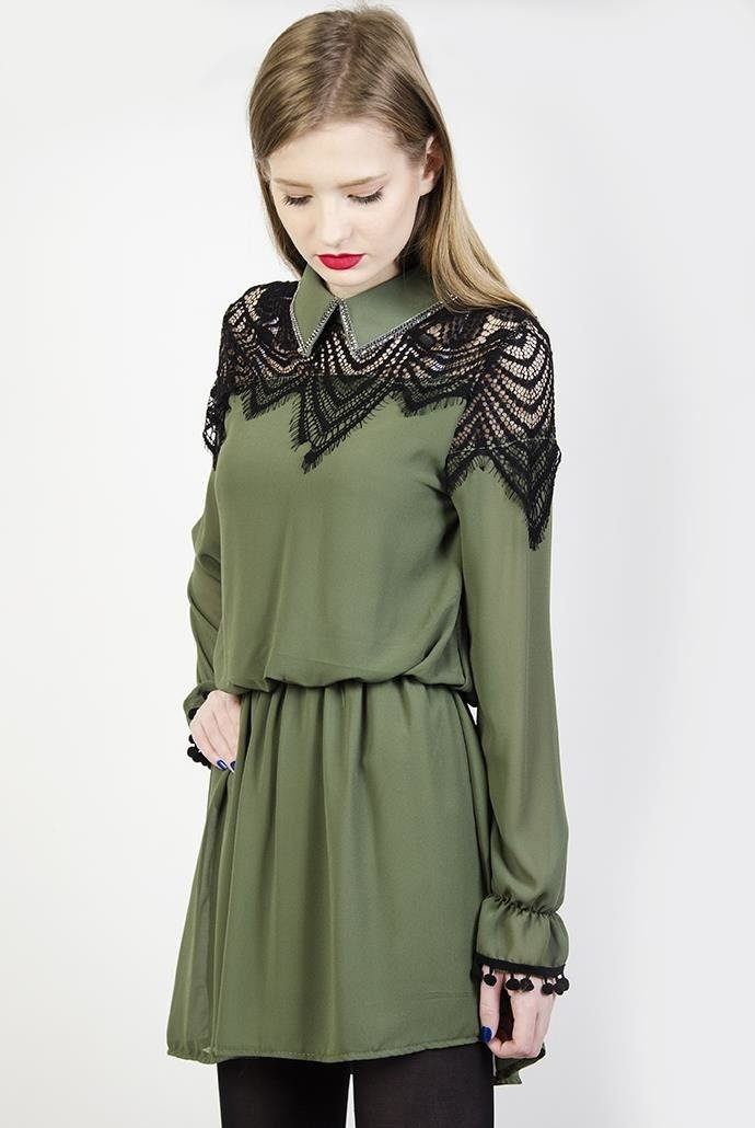 Zielona szyfonowa sukienka ze zdobieniem i kołnierzykiem