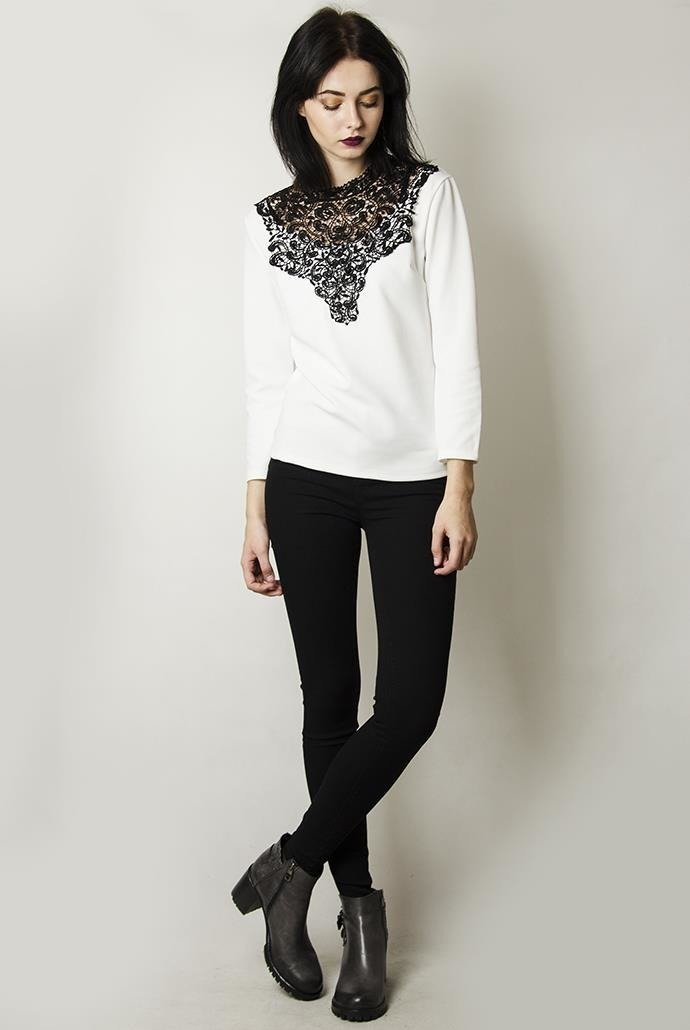 Biała bluzka z czarnym zdobieniem przy dekolcie., z tyłu posiada zapięcie.