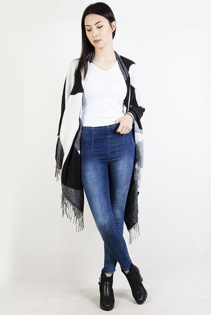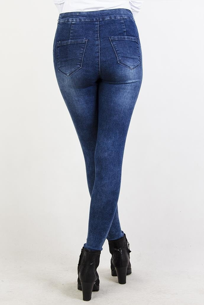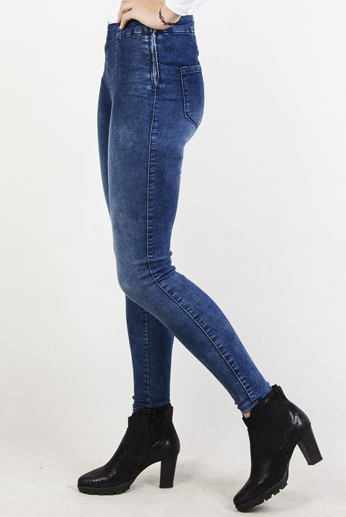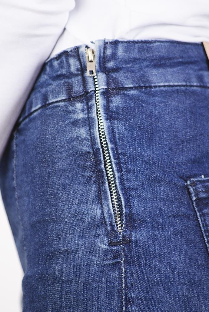 Jeansowe spodnie rurki z wysokim stanem i zamkiem z boku, z przodu przy pasie posiadają przeszycia.