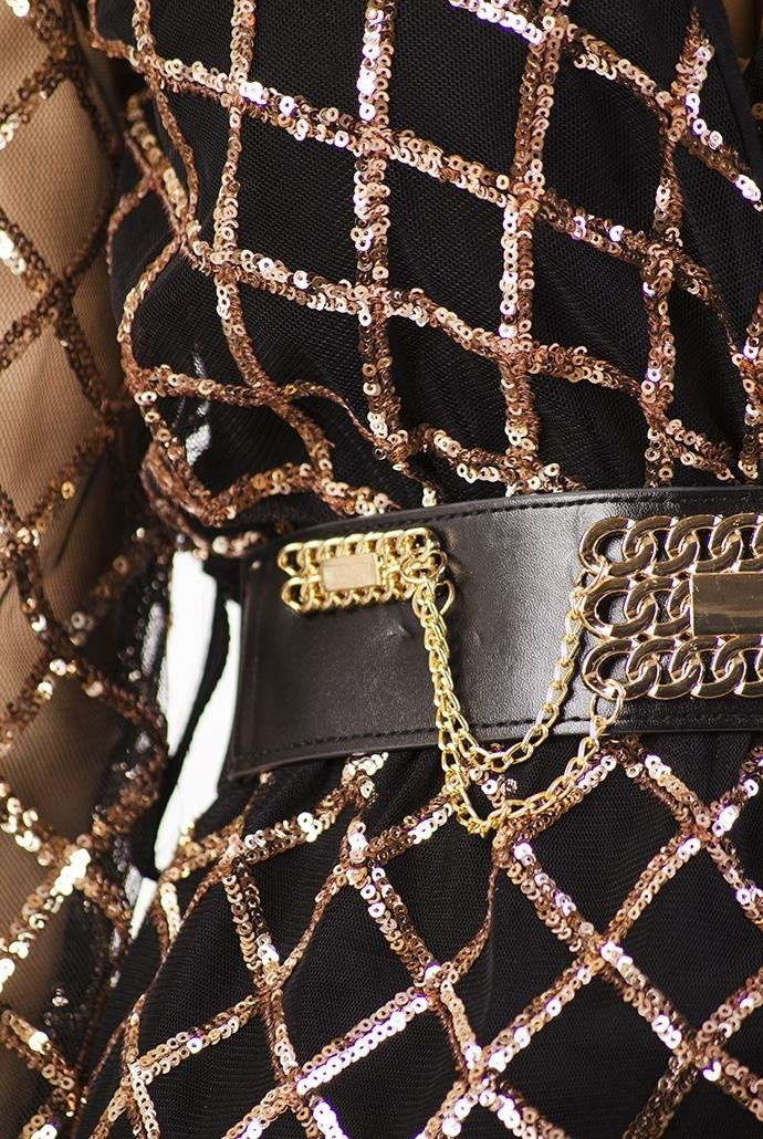 Czarna sukienka ze złotymi cekinami. Posiada ściągacz w talii oraz przy rękawach. Pasek dołączony do sukienki jest odpinany.