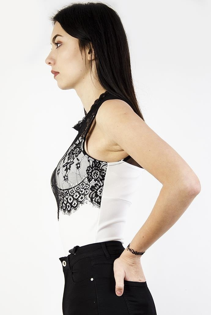 Białe body z wycięciem z tyłu oraz koronkowym zdobieniem z przodu. Z tyłu zapinane na guzik.