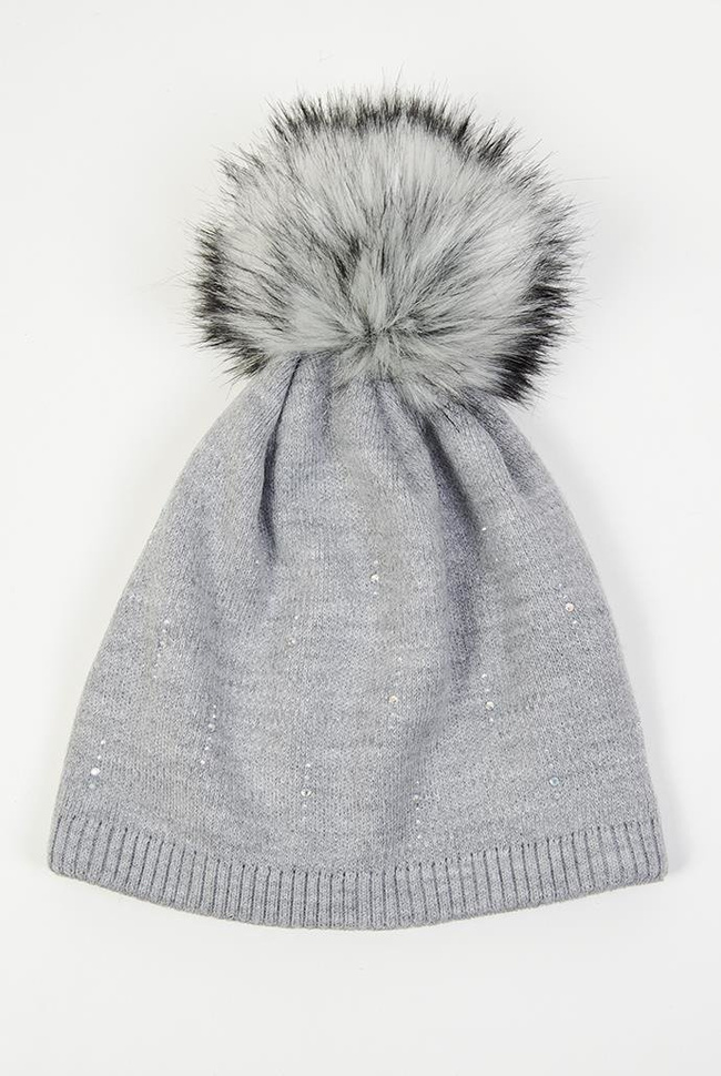 Jasnoszara czapka z cyrkoniami i pomponem, posiada ocieplenie wewnątrz w postaci polaru.