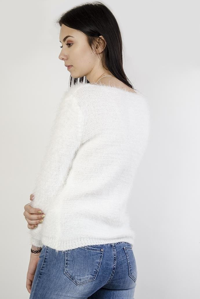 Biały, włochaty sweterek z wiązaniem w dekolcie.