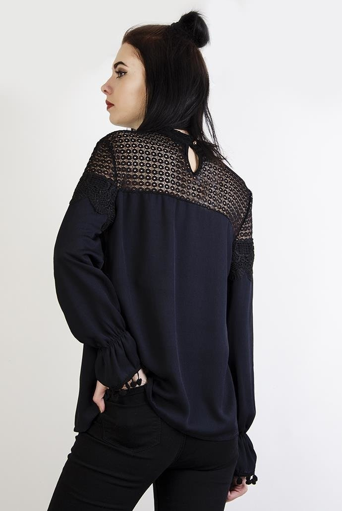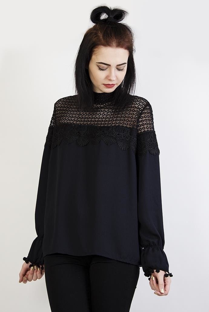 Granatowa bluzka z kulkami przy rękawach i ażurowymi wstawkami.