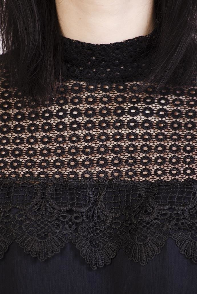 Granatowa bluzka z kulkami przy rękawach i ażurowymi wstawkami