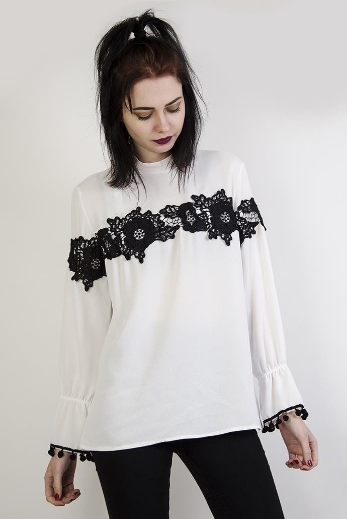 Biała bluzka z czarnym, ażurowym zdobieniem