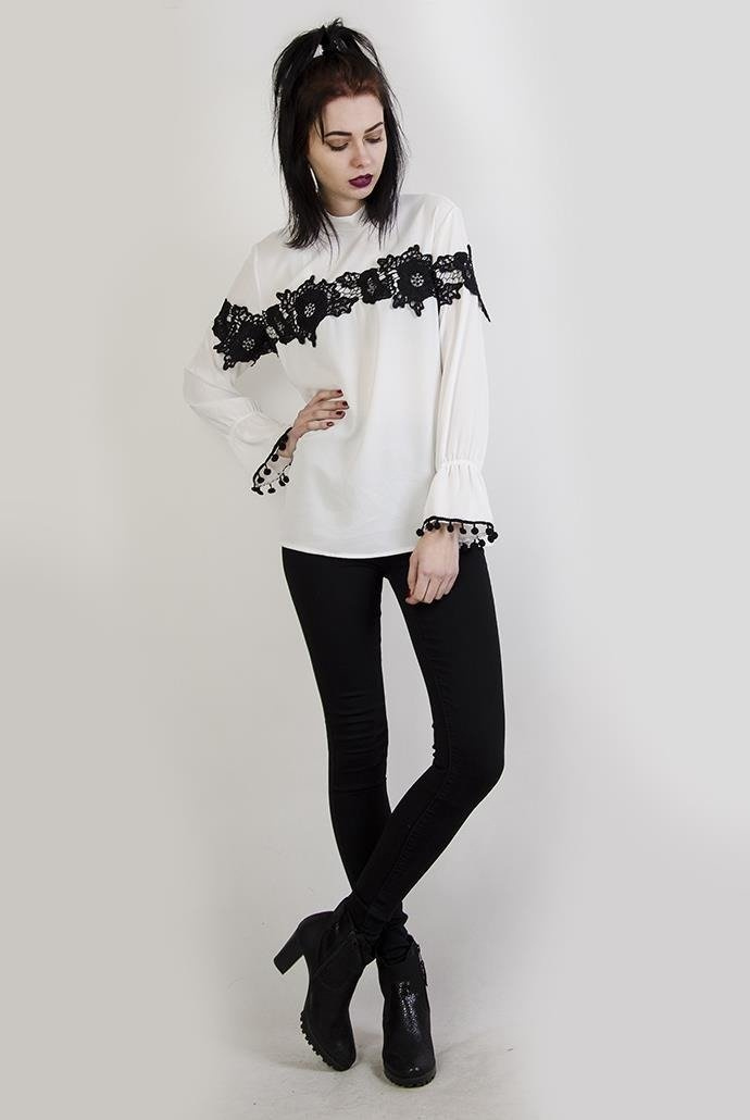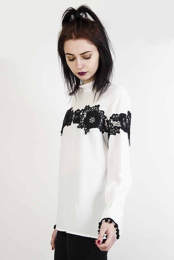 Biała bluzka z czarnym, ażurowym zdobieniem.