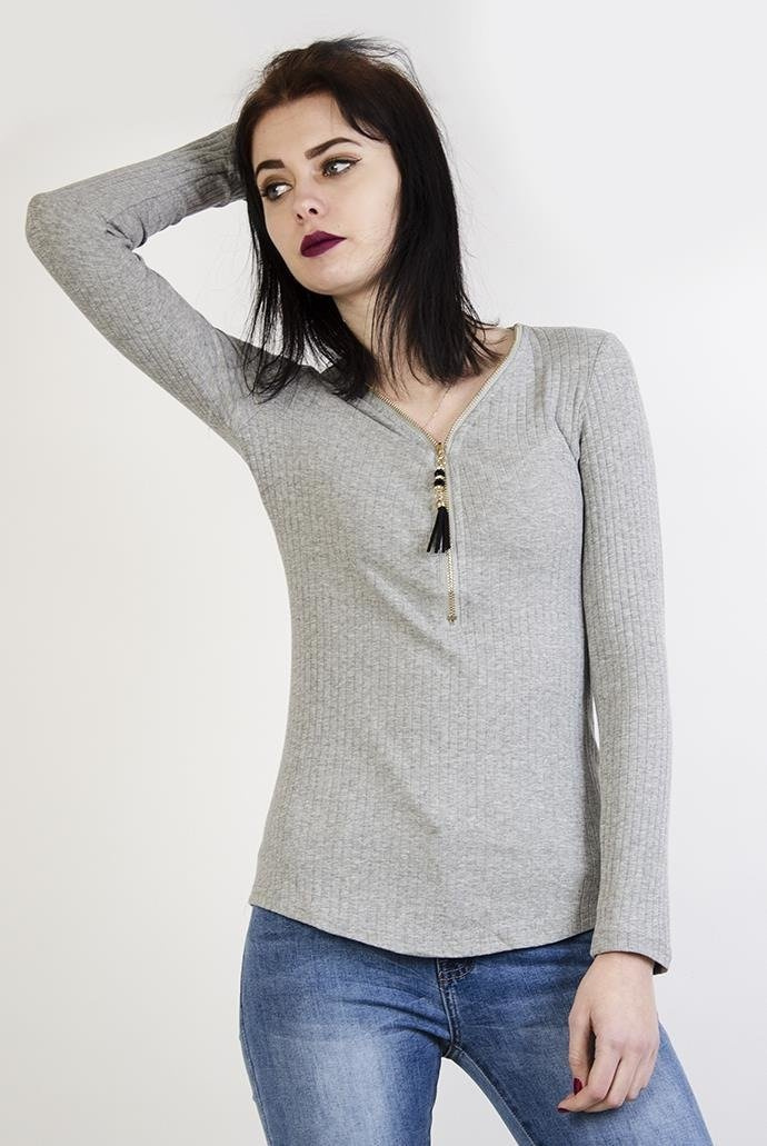 Jasnoszara prążkowana bluzka zapinana na zamek