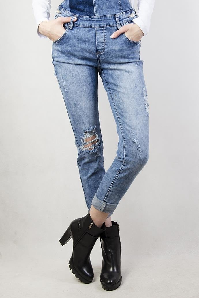 Spodnie jeansowe ogrodniczki, z przetarciami