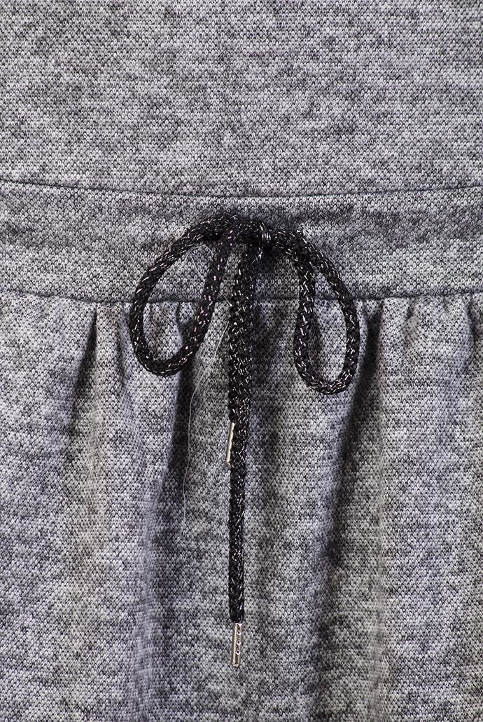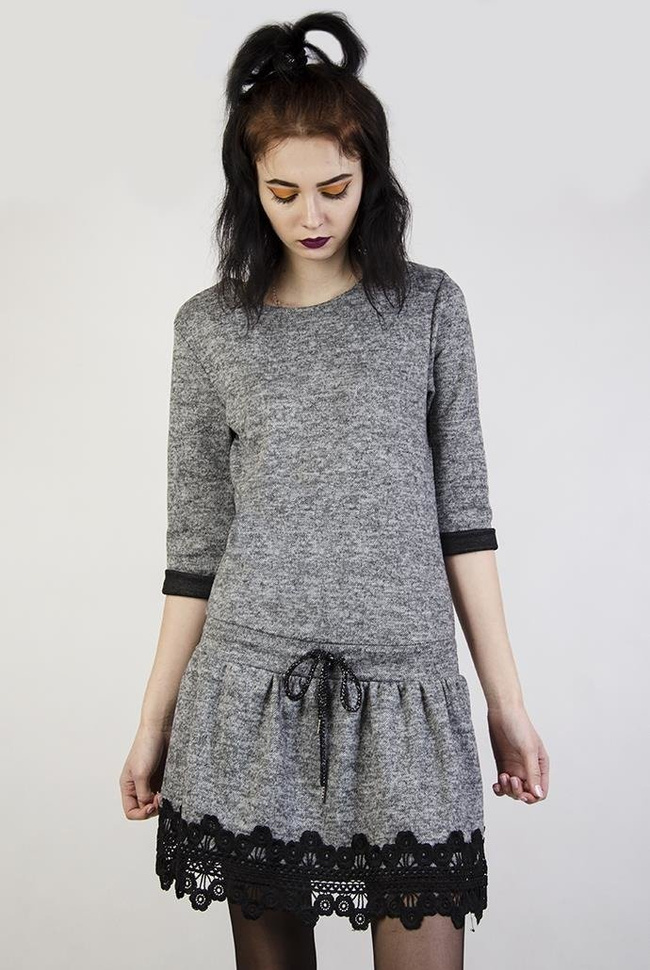 Szara sukienka ze sznurkiem w pasie i ażurowym zdobieniem na dole.