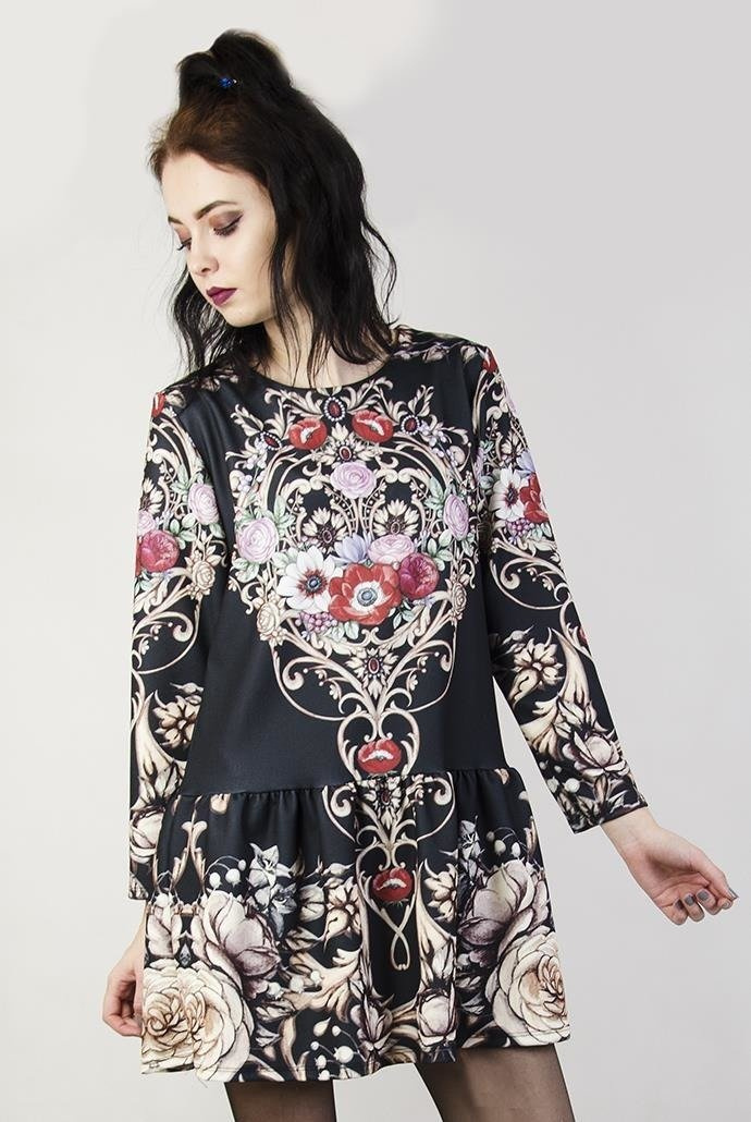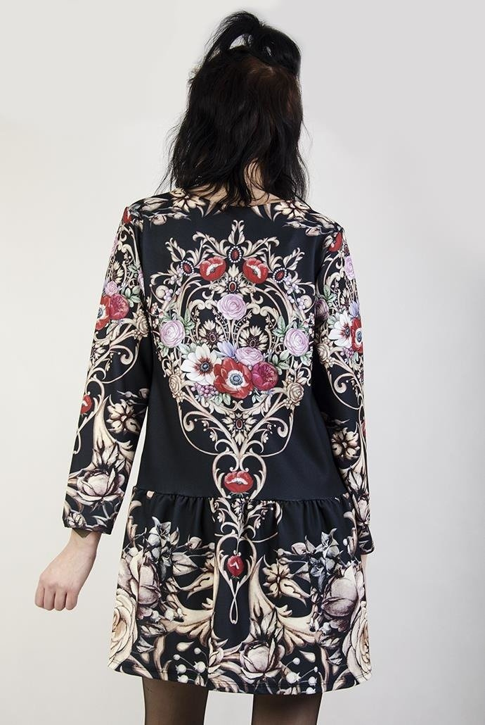 Wzorzysta, czarna sukienka z falbaną na dole.