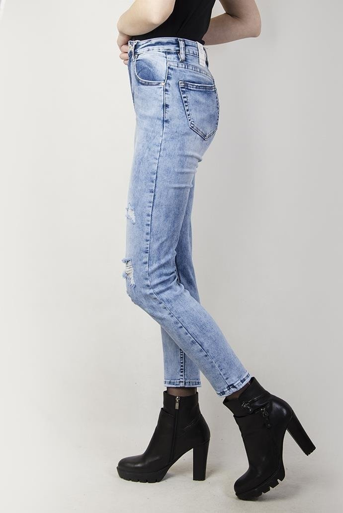 Jasne spodnie jeansowe z przetarciami i cieniowaniem. Wykonane z grubszego jeansu, posiadają wysoki stan.