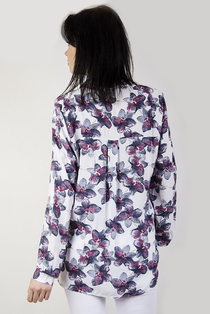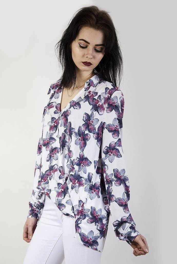 Biała, asymetryczna koszula w kwiaty z przeszyciem