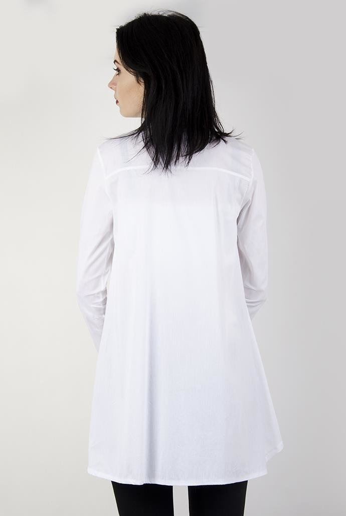 Biała koszula z wiązaniem przy szyi.