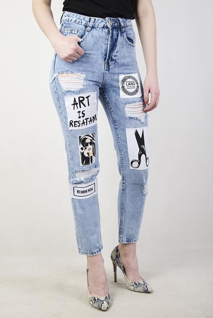 Spodnie jeansowe typu boyfriendy z naszywkami i dziurami