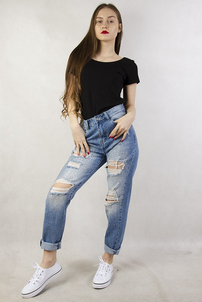 Spodnie jeansowe typu boyfriend z cyrkoniami i dziurami. Posiadają wysoki stan.