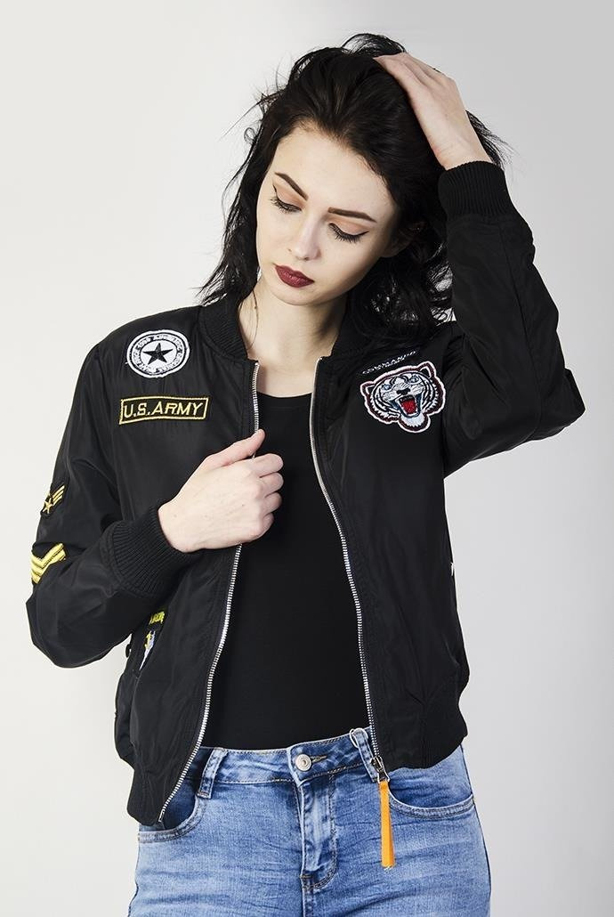Czarna kurtka z naszywkami typu bomber z pomarańczową podszewką.