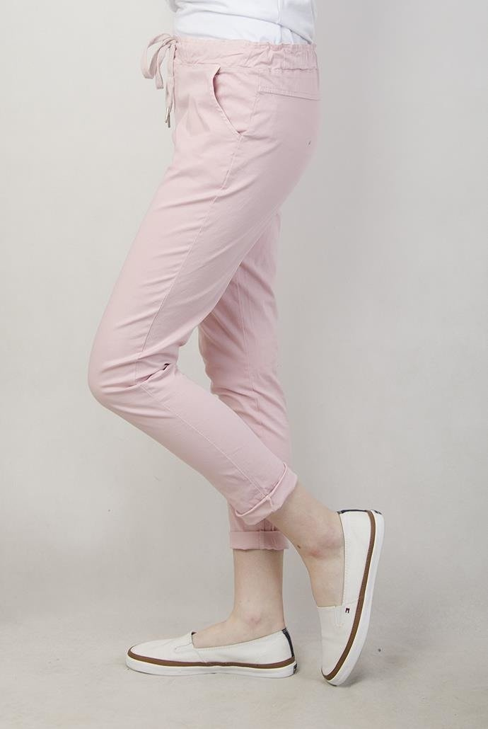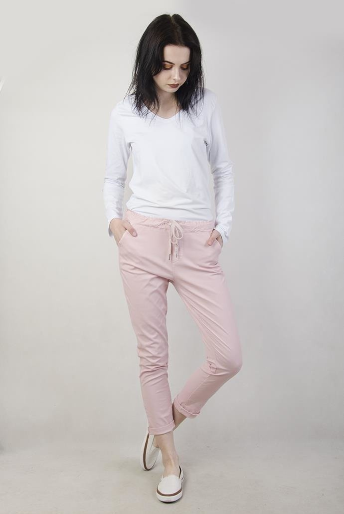 Jasnoróżowe spodnie z wiązaniem i gumą w pasie.