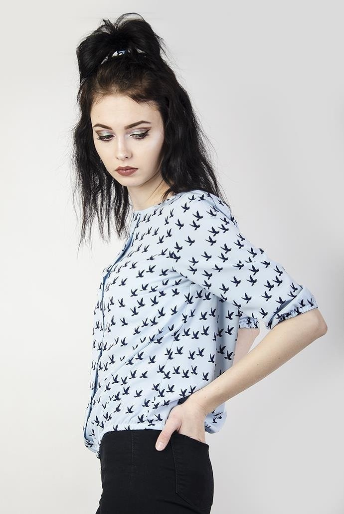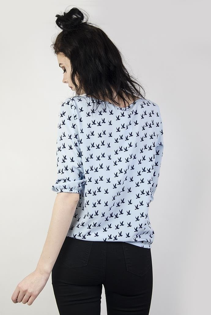 Jasnoniebieska bluzka w czarne jaskółki. Posiada gumkę na dole oraz przy rękawie.